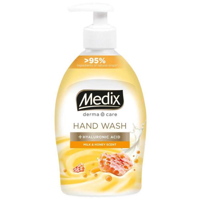 Medix Derma Care Hand Wash Milk & Honey е кремообразен течен сапун за ръце с хиалуронова киселина и нежен аромат на мляко и мед. Формулата съдържа комбинация от 7 уникални молекулни тегла на хиалуроновата киселина и овлажняващи съставки за нежна грижа и хидратация. Съставки с над 95% натурален произход. Медикс Дерма Кеър Мляко и Мед Течен сапун е подходящ за ежедневна употреба.