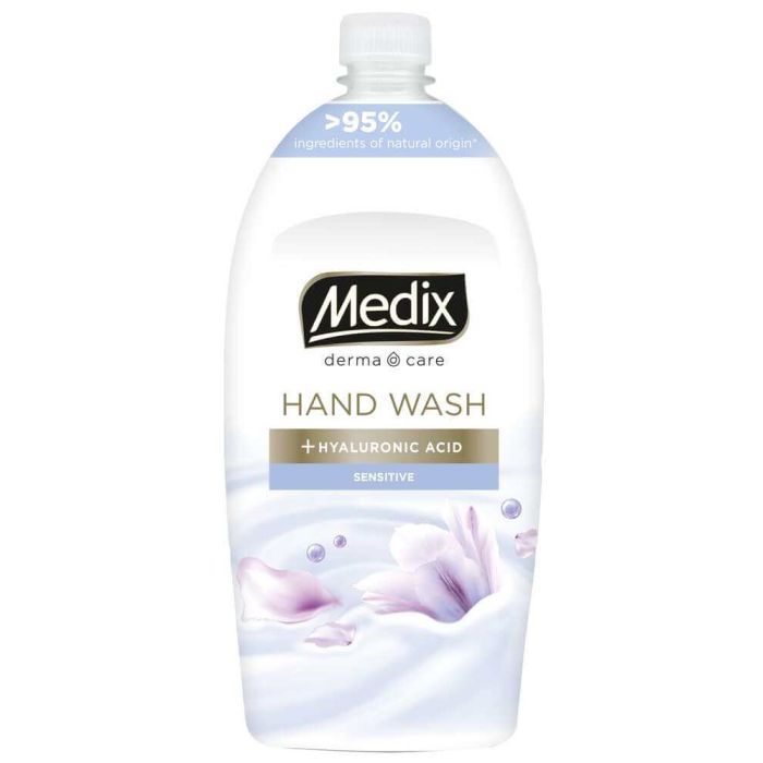 Medix Derma Care Hand Wash Sensitive е кремообразен течен сапун за ръце с хиалуронова киселина и нежен аромат. Формулата съдържа комбинация от 7 уникални молекулни тегла на хиалуроновата киселина и овлажняващи съставки за нежна грижа и хидратация. Съставки с над 95% натурален произход. Медикс Дерма Кеър Сензитив Течен сапун е подходящ за ежедневна употреба. Подходящ за хора с чувствителна кожа.