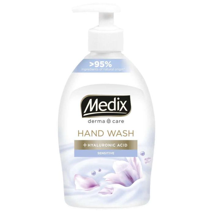 Medix Derma Care Hand Wash Sensitive е кремообразен течен сапун за ръце с хиалуронова киселина и нежен аромат. Формулата съдържа комбинация от 7 уникални молекулни тегла на хиалуроновата киселина и овлажняващи съставки за нежна грижа и хидратация. Съставки с над 95% натурален произход. Медикс Дерма Кеър Сензитив Течен сапун е подходящ за ежедневна употреба. Подходящ за хора с чувствителна кожа.