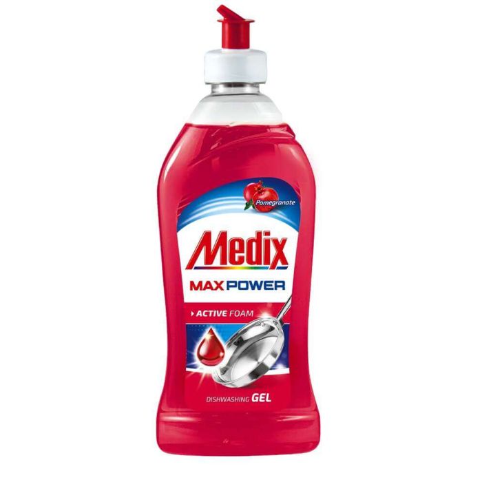 Medix Max Power Dishwashing Gel Pomegranate e измиващ гел срещу мазнини и засъхнали остатъци от храна по съдовете. За безкомпромисно измиващо действие и блестяща чистота на съдовете. Медикс Макс Пауър Гел за съдове е със свежо ужание на нар.