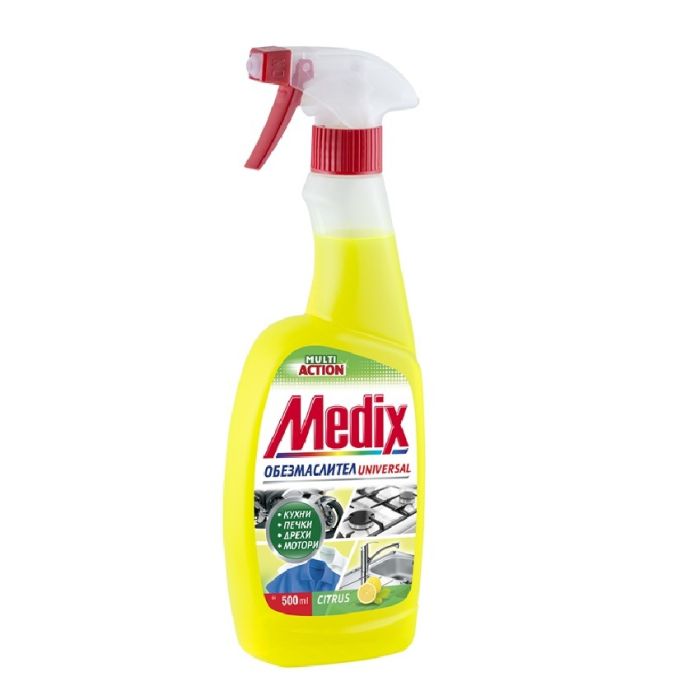 Medix Multi action Citrus е многофункционален почистващ препарат с освежаващ портокалов аромат, подходящ за употреба в дома, кухнята, гаража и работни помещения. Формулата му разгражда и премахва мазни петна, наслоявания от масла, замърсявания и остатъци от храна, като оставя повърхностите чисти и свежи. Практичната помпа осигурява удобно и контролирано дозиране. Медикс Мулти екшън цитрус Универсален обезмаслител с помпа е подходящ за кухненски плотове, котлони, аспиратори, фурни, работни повърхности, инструменти и други миещи се повърхности, както и за някои видове текстил.