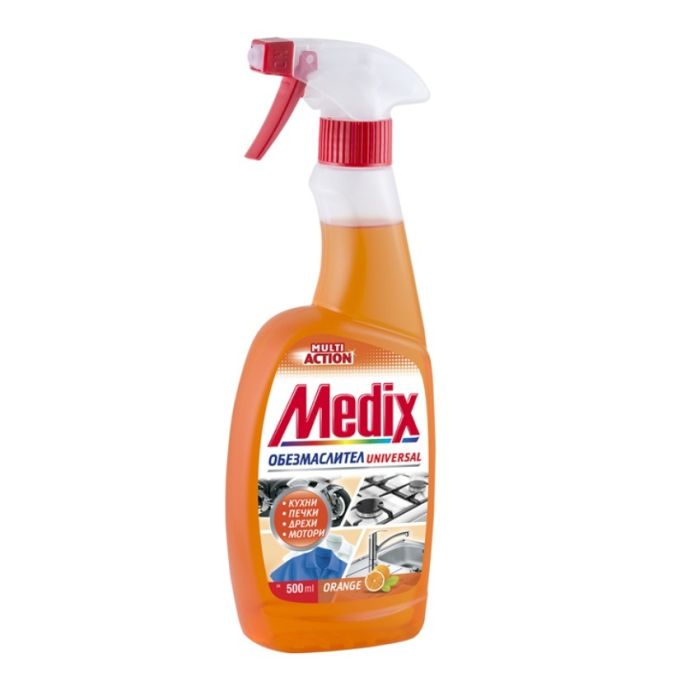 Medix Multi action Orange е многофункционален почистващ препарат с освежаващ портокалов аромат, подходящ за употреба в дома, кухнята, гаража и работни помещения. Формулата му разгражда и премахва мазни петна, наслоявания от масла, замърсявания и остатъци от храна, като оставя повърхностите чисти и свежи. Практичната помпа осигурява удобно и контролирано дозиране. Медикс Мулти екшън портокал е подходящ за кухненски плотове, котлони, аспиратори, фурни, работни повърхности, инструменти и други миещи се повърхности, както и за някои видове текстил.
