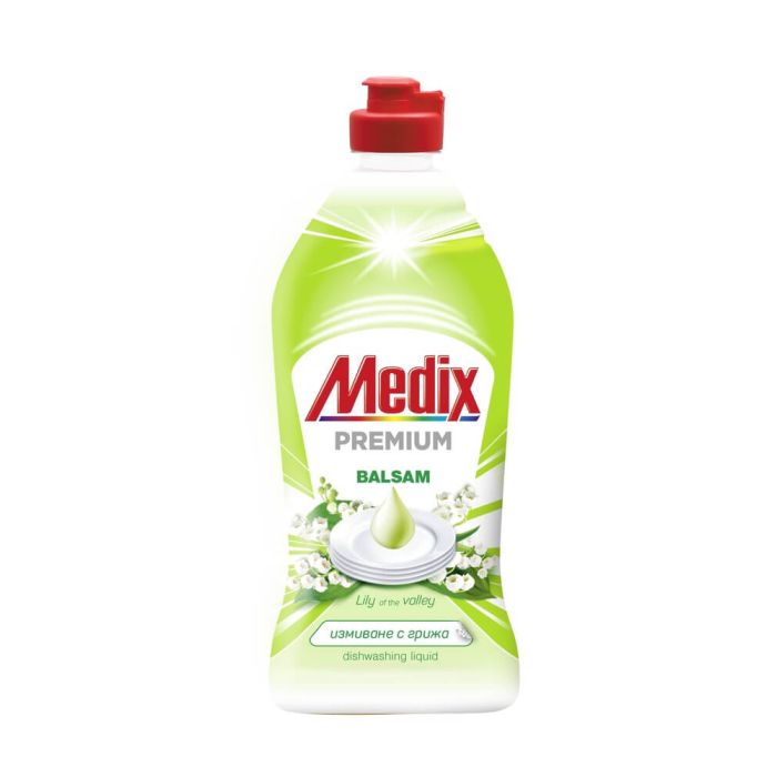 Medix Premium Balsam Dishwashing Liquid Lily of the Valley e най-мощната формула на Medix срещу мазнини. Медикс Премиум Балсам Kонцентриран балсам за съдове Момина сълза е безмилостен към мазнините и упоритите остатъци от храна. Със свеж флорален аромат. Активните компоненти и дълготрайна пяна осигуряват ефикасно измиване за блестящи от чистота съдове и прибори.