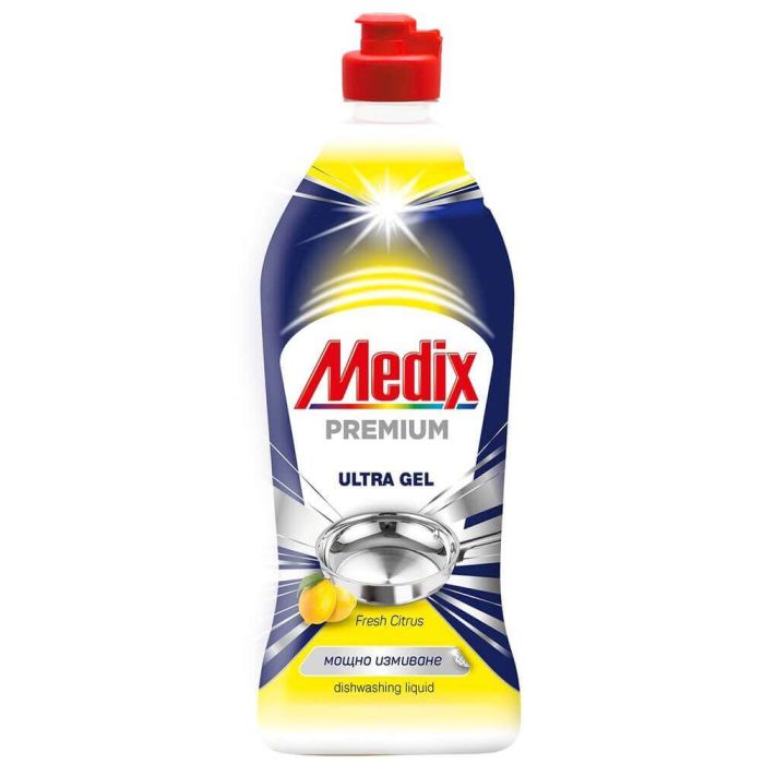Medix Premium Ultra Gel Dishwashing Liquid Fresh Citrus e най-мощната формула на Medix срещу мазнини. Медикс Премиум Гел Kонцентриран гел за съдове Цитрус е безмилостен към мазнините и упоритите остатъци от храна. Със свеж плодов аромат. Активните компоненти и дълготрайна пяна осигуряват ефикасно измиване за блестящи от чистота съдове и прибори.