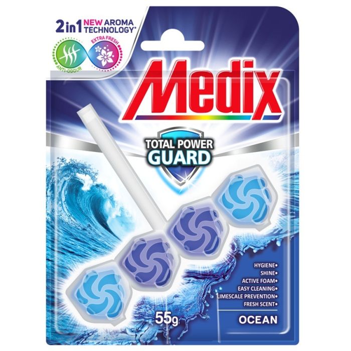 Medix WC Blocks Total power guard Ocean активно почиства вътрешността на тоалетната чиния. Формулата му подпомага предотвратяването на натрупването на варовик и замърсявания, като същевременно поддържа високо ниво на хигиена и притежава приятен, дълготраен аромат. Благодарение на защитната технология Total Power Guard, повърхността остава по-чиста за по-дълго време. Медикс ВЦ Блок Тотал пауър гард Блу пауър Твърдо тоалетно блокче, Океан е подходящ за ежедневна поддръжка и хигиена на тоалетната чиния. Притежава силата на ароматизатор и елиминира неприятна миризма.