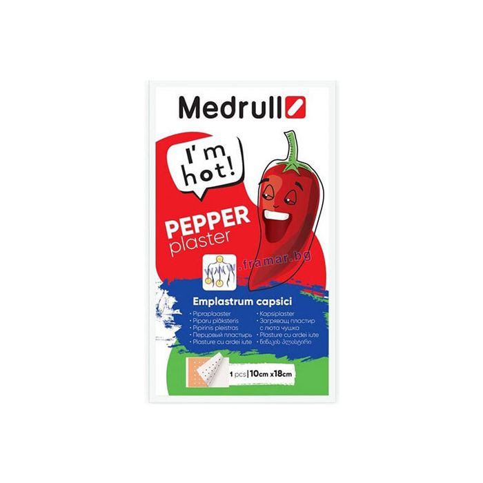 Medrull Pepper Hot Plaster е ефективно средство за локално облекчаване на мускулни и ставни болки, схващания, напрежение и дискомфорт. Съдържа екстракт от люта чушка, който стимулира кръвообращението в засегнатата зона и създава затоплящ ефект, подпомагащ отпускането на мускулите и облекчаването на болката. Подходящ е при болки в гърба, кръста, врата, раменете, както и при навяхвания и преумора. Пластирът е лесен за поставяне, прилепва стабилно към кожата и осигурява продължително действие.