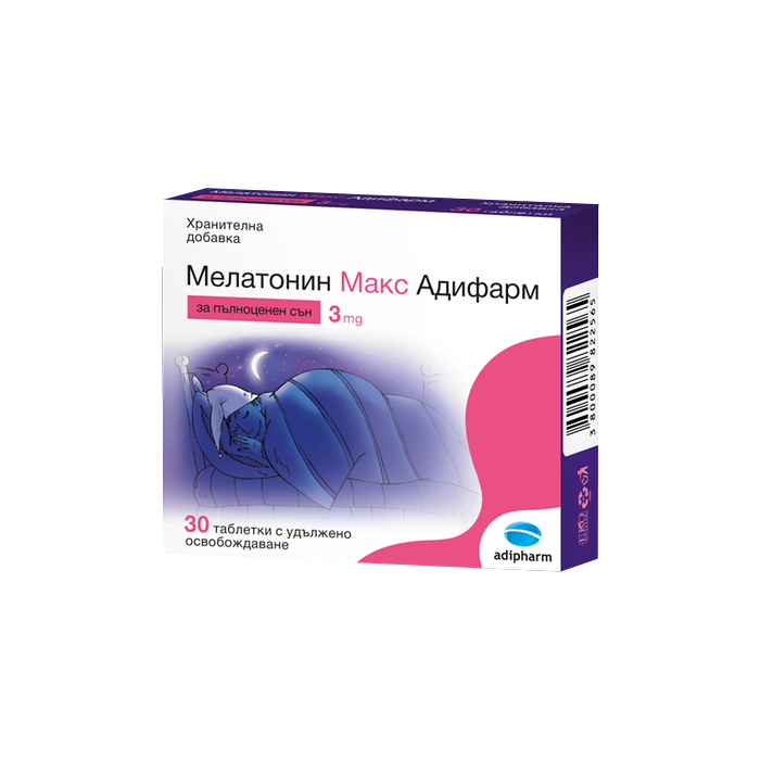 Мелатонин Макс Адифарм е хранителна добавка под формата на таблетки с удължено освобождаване, която осигурява пълноценен нощен сън, близък до физиологичния. Таблетките с удължено освобождане Мелатонин Макс Адифарм позволяват постепенното разтваряне в организма на оптимално количество от 3 mg melatonin, необходимо за спокоен и качествен сън.