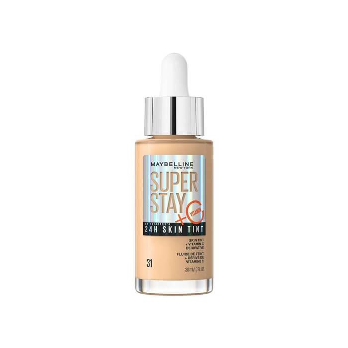 Maybelline SuperStay 24 h Skin Tint е тониращ флуид за лице с витамин C, който прикрива неравностите и зачервяванията. Придава свежест и сияние на лицето. Мейбълин СуперСтей 24 ч Фон дьо тен за лице осигурява леко до средно покритие, за естествен вид на кожата. То е дълготрайно и издържа до 24 часа. Иновативната формула е обогатена с витамин C, който притежава антиоксидантни, противовъзпалителни, подмладяващи и изсветляващи свойства. Той придава на кожата здравословен и сияен вид, бори се с хиперпигментацията и сухотата. Серумът оставя приятно и леко усещане върху кожата. Той не запушва порите и е подходящ за всеки тип кожа, включително чувствителна. Формулата е веган. Дерматологично тестван продукт.