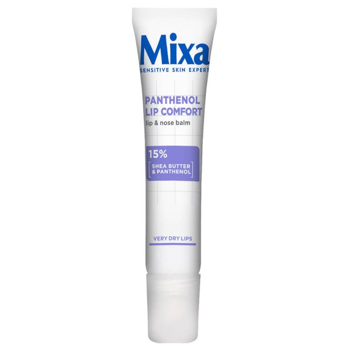Mixa Panthenol Comfort Lip & Nose Balm e балсам за устни и зоната около носа, който незабавно успокоява и намалява дискомфорта на чувствителната кожа. Микса Пантенол Комфорт Балсам за устни и нос е подходящ за деца и възрастни. Формулиран с 15% масло от карите и пантенол, за да омекоти, подхрани и успокои 100% чувствителни, сухи и увредени устни и зоната около носа.