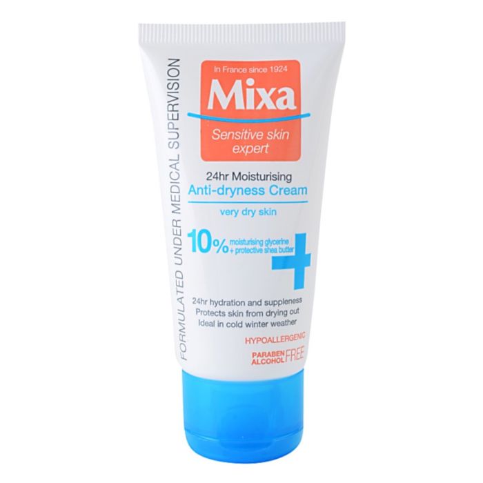 Mixa Sensitive Skin Expert 24hr moisturising Anti-Dryness Cream for very dry skin представлява богат хидратиращ крем за лице за суха кожа, който я овлажнява и подхранва в дълбочина. Микса 24ч. Богат Хидратиращ Крем за Лице е специално създаден против изсушаване на много сухата и дехидратирана кожа. Благодарение на формулата си с 10% глицерин в комбинация с масло от ший, кожата на лицето е подхранена и защитена от вредното въздействие на околната среда. Кремът за лице е подходящ за употреба през студените зимни месеци, когато кожата губи най-много от естествената си влага. След употреба на крема кожата е хидратирана, подхранена и защитена през целия ден и тя изглежда свежа, сияйна и еластична. Без парабени. Хипоалергенен.