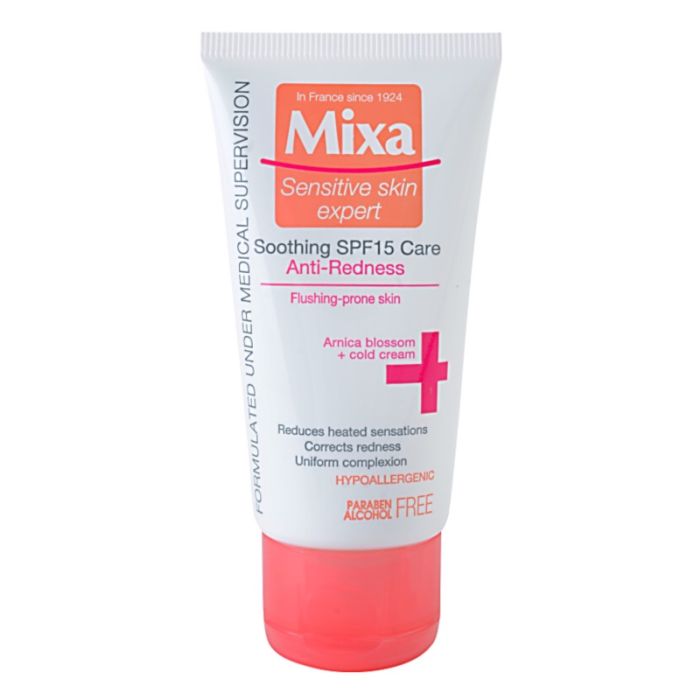 Mixa Sensitive Skin Expert Soothing SPF15 Care Anti-Redness e козметичен продукт, който е предназначен да успокои, да тонира и да остави кожата перфектна. Микса Анти Реднес СС Крем за лице SPF15, който е специално създаден за чувствителна кожа, склонна към зачервявания. Формулата на крема съдържа прецизно подбрани съставки, които осигуряват безвредна и ефикасна грижа. Благодарение на активната съставка -Арника, кожата е успокоена, a зачервяванията са намаляли. Кремът осигурява ефикасна защита срещу вредните влияния на околната среда, благодарение на своя слънцезащитен фактор SPF15. Редовната употреба на крема изравнява тена на кожата, благодарение на Технологията “СС” за прогресивно коригиране на цвета на тена през деня. Без парабени. Дерматологично тестван. Хипоалергенен.