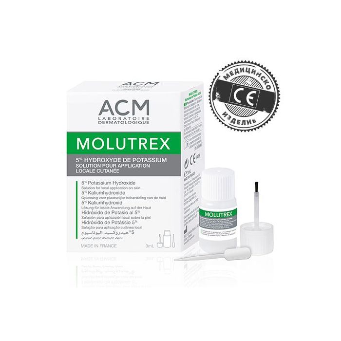 Molutrex 5% Potassium Hydroxide Мolluscs Treatment ACM е разтвор за локално приложение при третиране на молуски (Molluscum contagiosum). Молуските представляват полусферични, перловидни лезии на кожата, с леко хлътване в центъра. Най-често са множествени и с различен размер. Molluscum contagiosum е доброкачествено и силно заразно вирусно заболяване на кожата. Като цяло засяга кожата, а понякога и лигавицата. Често срещано при деца с атопична кожа. Молутрекс Калиева основа за молуски АЦМ се предлага във флакон, с предпазна капачка с четка и тънък апликатор.