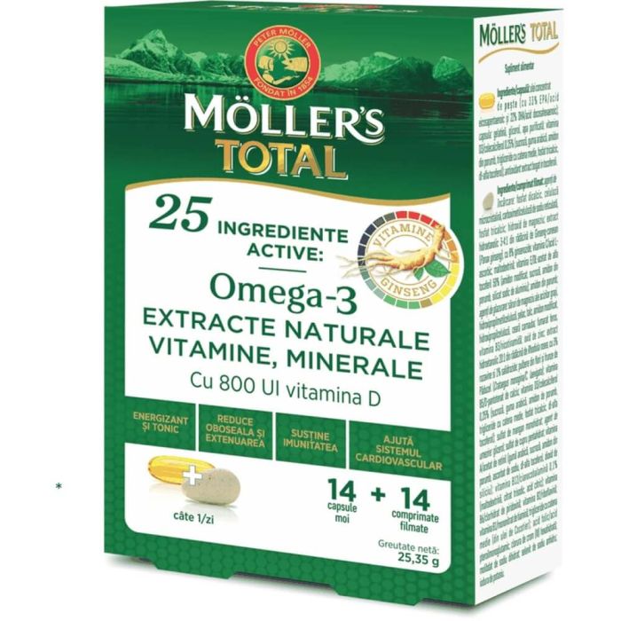 Möller’s Total Multivitamins e хранителна добавка, която в подкрепа на имунитета. Намалява умората и изтощението и помага на сърдечно-съдовата система. Омега-3 полиненаситените есенциални мастни киселини (DHA и EPA) допринасят за нормалната сърдечна функция. Витамин D присъства както в капсулата, така и във филмираната таблетка, което води до общо 800 IU (международни единици). Мьолерс Тотал Мултивитамини има модерна формула, проектирана в топ фабрика в Дания, с голямо внимание към детайла.