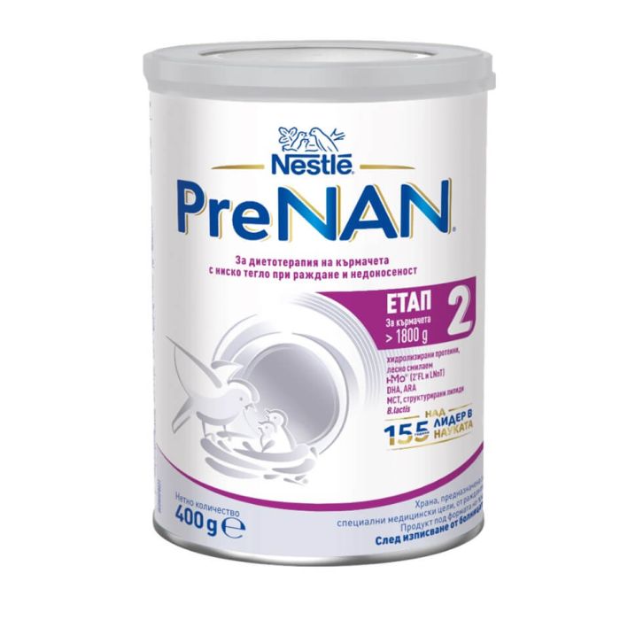 Nestle PreNAN Stage 2 е храна за специални медицински цели, която е предназначена за недоносени и родени с ниско тегло бебета. Нестле ПреНАН Етап 2 осигурява адекватни количества хранителни вещества за задоволяване на бързите нужди за растеж и развитие на недоносени или бебета с ниско тегло при раждане, над 1800 г. Използването на PreNAN® Етап 2 след изписване до 9-месечна коригирана възраст, може да доведе до по-бързо увеличаване на теглото, в сравнение с другите стандартни млека за кърмачета. Нова формула обогатена с така важните Олигозахариди, който са структурно идентични, с тези открити в кърмата и отговарят за оптималното развитие на имунитета при бебетата и малките деца.