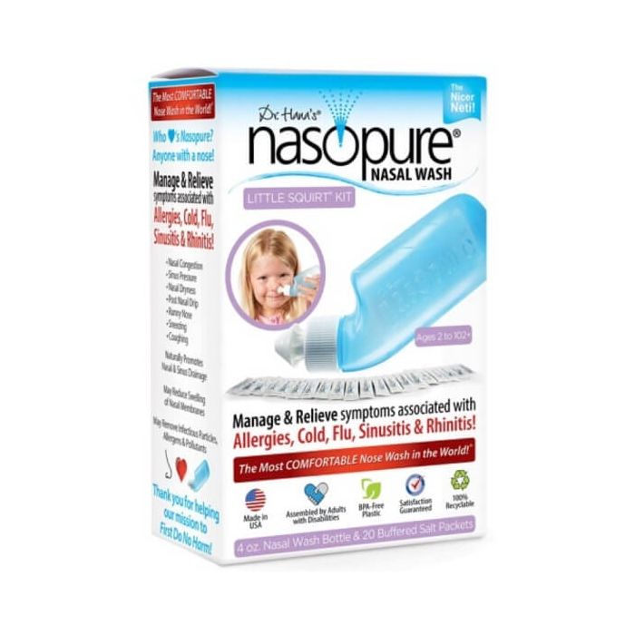 Nasopure Nasal Wash представлява система за носни промивки, съдържаща специализирана бутилка с накрайник и сашета с буферирана сол и сода бикарбонат. Назопюр Комплект за носни промивки за деца прочиства носа и синусите без да ги изсушава. Подходящ е за деца и неговото използване по време на грип и настинка спомага да се ограничи стичането на непочистения носен секрет в носоглътката и трахеята. Продуктът има всички необходими сертификати за качество и безопасност, одобрен е от асоциацията на педиатрите в САЩ.