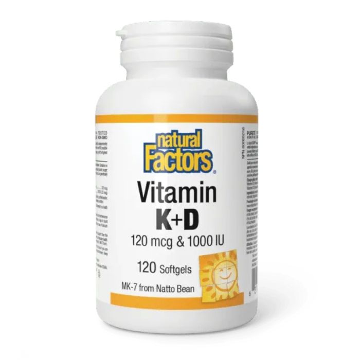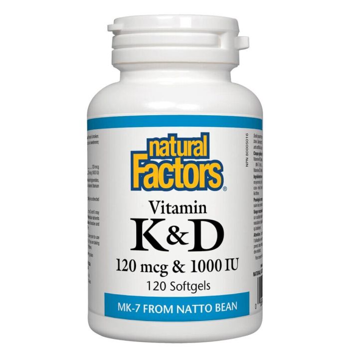 Vitamin K2 120 mcg & D3 1000 IU на Natural Factors съдържа К2 под формата на менахинон-7 (МК-7), получен при ферментацията на соеви зърна, от които се приготвя традиционната японска храна натто и D3 (холекалциферол). D3 (холекалциферол) е естествената, безопасна и биоактивна форма на витамин D. Комбинирането на витамин D3 и К2 спомага за по-доброто им усвояване, отколкото при индивидуален прием.