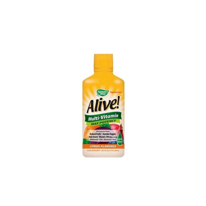 Nature's Way Alive! Multi-Vitamin Max Potency е хранителна добавка, която укрепва всички органи и системи в тялото и по естествен начин намалява умората и усещането за стрес. Регенерира нервната система и работи в полза на когнитивните способности, като благоприятства паметта, концентрацията и тонуса. Допринася за поддържане нормалното състояние на дебелото черво, костите, зрението и сърдечно-съдовата система. Повишава енергията и жизнеността. Подсилва имунната система. Продуктът съдържа 25 витамини и минерали, 10 аминокиселини, 14 зелени храни, 12 органично отгледани медицински гъби и 40 антиоксиданти, включително лутеин. Нейчърс Уей Алайв Течен мултивитамин е подходящ за употреба от вегетарианци и вегани.