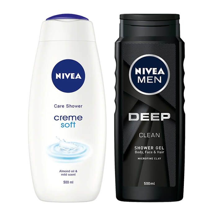 Комплектът съдържа: Nivea Creme Soft Нежен душ-крем за тяло 500 мл 1 бр + Nivea Men Deep Clean Душ гел за мъже с глина 500 мл 1 бр.