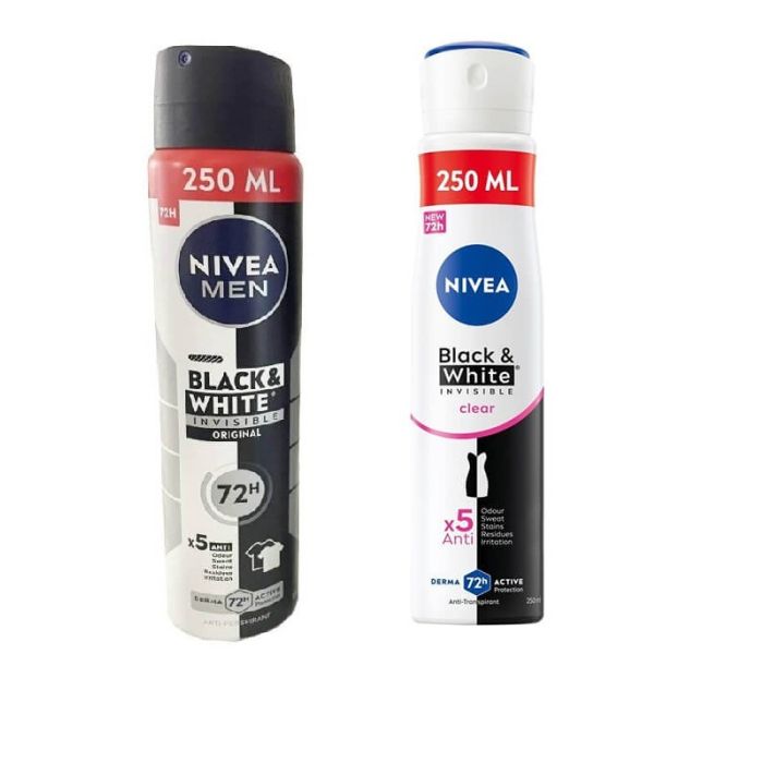 Комплектът съдържа: Nivea Men Black & White Invisible Original Дезодорант спрей против изпотяване за мъже 250 мл 1 бр + Nivea Black & White Invisible Clear Дезодорант спрей против изпотяване за жени 250 мл 1 бр.