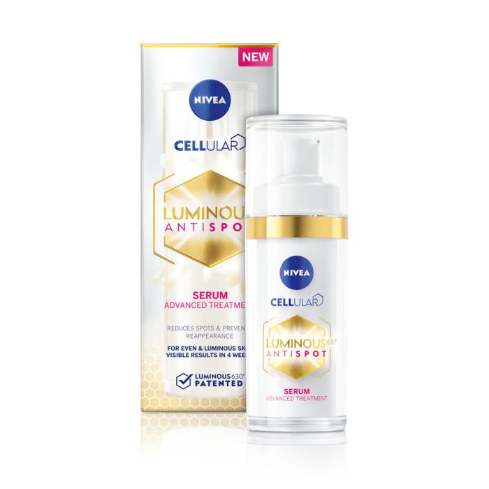 Nivea Cellular Luminous 630 Antispot Serum e серум за лице, който намалява пигментните петна, причинени от излагане на слънце, стареене на кожата, хормонални промени и предотвратява тяхната повторна поява - за красива кожа и равномерен тен. Нивеа Селюлар Луминъс 630 Антиспот Серум срещу пигментни петна действа върху съществуващите пигментни петна: изсветлява и намалява големината им и балансира производството на меланин в кожата, за да предотврати появата на нови петна. Специалната формула съчетава иновативната съставка LUMINOUS630 в най-високата си концентрация с витамин Е и активираща клетките хиалуронова киселина. С нежна текстура и лека формула, серумът се абсорбира бързо. Деликатен е към кожата и се препоръчва за всички типове кожа, включително чувствителна. Дерматологично тестван продукт.