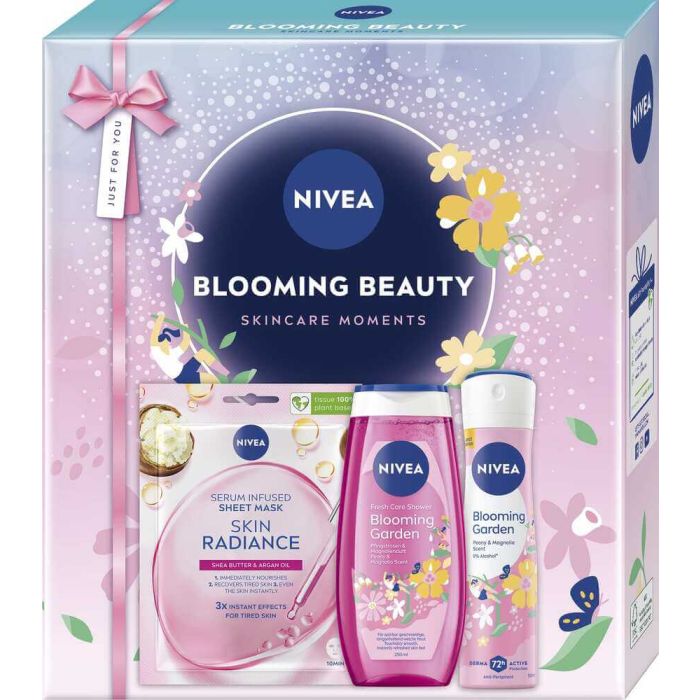 Комплектът съдържа: Nivea Blooming Garden Душ гел с аромат на цветя 250 мл 1 бр + Nivea Blooming Garden Дезодорант против изпотяване за жени с аромат на цветя 150 мл 1 бр + Nivea Skin Radiance Лист маска за лице за уморена кожа 1 бр.