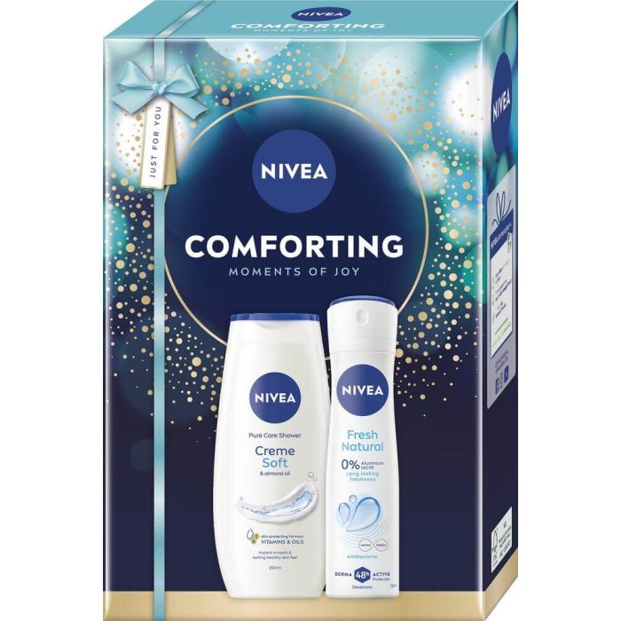 Комплектът съдържа: Nivea Creme Soft Нежен душ-крем за тяло 250 мл 1 бр + Nivea Fresh Natural Дезодорант спрей против изпотяване за жени 150 мл 1 бр.
