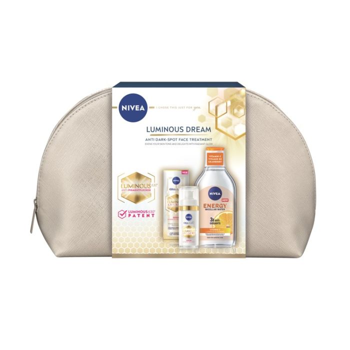 Комплектът съдържа: Nivea Cellular Luminous Antispot Серум срещу пигментни петна 30 мл 1 бр + Nivea Energy Мицеларна вода с витамин C 400 мл 1 бр + Стилен бежов несесер