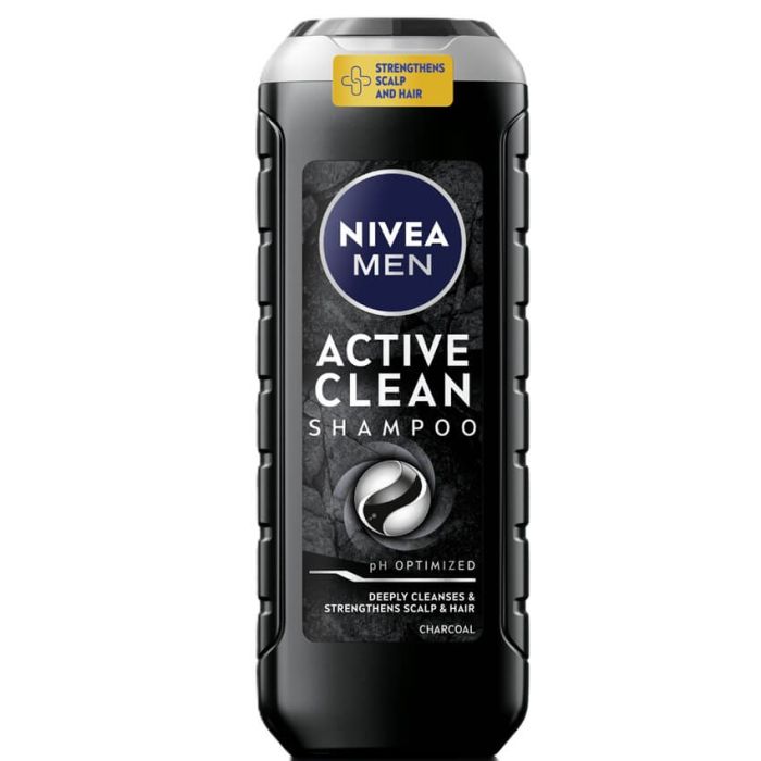Nivea Men Active Clean Shampoo е дълбоко почистващ шампоан за коса за мъже, предназначен за всеки тип коса. Подходящ за ежедневна употреба. Специалната формула съдържа активен въглен, който е познат с възможността си да абсорбира ефективно замърсявания. Нивеа Мен Актив Клийн Шампоан за мъже с активен въглен почиства косата в дълбочина и премахва всички видове замърсявания, включително излишното омазняване и остатъци от стилизиращи продукти, като оставя след себе си чувство за свежест. Употребата на продукта гарантира енергизиране и дълбоко почистване на косата и скалпа. Дерматологично тестван продукт.