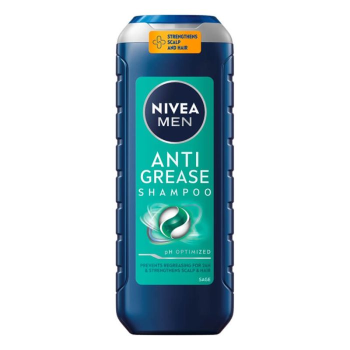 Nivea Men Anti Grease Shampoo е шампоан за мъже против бързо омазняване, който ефективно премахва излишния себум и замърсяванията и предотвратява повторното омазняването на скалпа. Нивеа Мен Анти Грийс Шампоан против омазняване за мъже оставя дълготрайно усещане за чистота и свежест. Специалната формула стимулира растежа, укрепва косата и я тонизира. Формула е с балансирано pH. Подходящ за ежедневна употреба. Дерматологично тестван продукт.