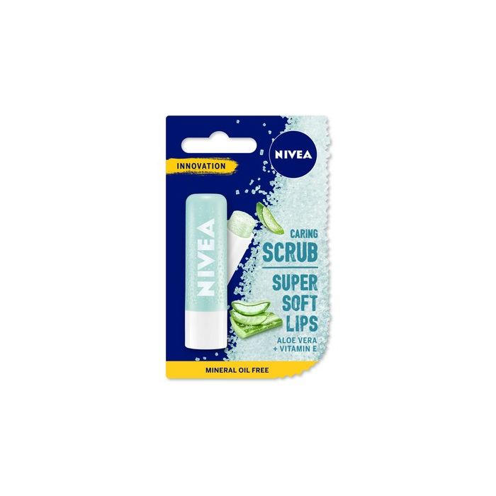 Nivea Lip Care Scrub Aloe е иновативен пилинг за устни във формата на стик, който придава на устните кадифена гладкост и мекота. Специалната формула съдържа естествено добити пилинг частици от царевично нишесте, които нежно ексфолират устните, без да дразнят чувствителната кожа. Те се разтварят мигновено, нужно е само да допрете устните си една в друга. Формулата включва и алое вера, което интензивно хидратира и подхранва кожата. Добавеният витамин Е има овлажняващи, противовъзпалителни, регенериращи и антиоксидантни свойства. Нивеа Лип Кеър Балсам пилинг за устни с алое образува лек защитен слой, който не предизвиква лепкаво усещане. Той оставя устните копринено гладки, меки и подхранени. Без минерални масла и парабени. Дерматологично тестван продукт.