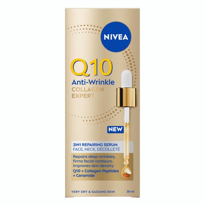 Nivea Q10 Anti-Wrinkle Collagen Expert 3in1 Serum е серум за лице, който подобрява еластичността на кожата, видимо намалява дори най-дълбоките бръчки и линии на изразяване, стяга и оформя контурите на лицето и намалява отпускането на кожата. Нивеа Q10 Колаген Експерт Серум 3в1 за лице е подходящ за много суха и отпусната кожа. Дерматологично одобрена съвместимост с кожата.