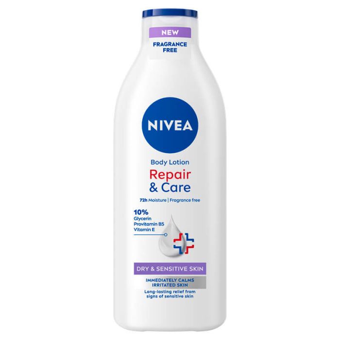 Nivea Repair & Care Body Lotion е хидратираща формула за тяло, разработена за суха и много суха кожа. Лосионът интензивно хидратира и успокоява кожата, благодарение на глицерина и пантенола, които са активна част от формулата. Помага за задържане на влагата в продължение на 72 часа. Нивеа Хидратиращ и възстановяващ лосион за тяло има лека текстура, която попива бързо. Продуктът осигурява оптимален комфорт, възвръщайки мекотата на кожата. Без аромат. Дерматологично тестван продукт.