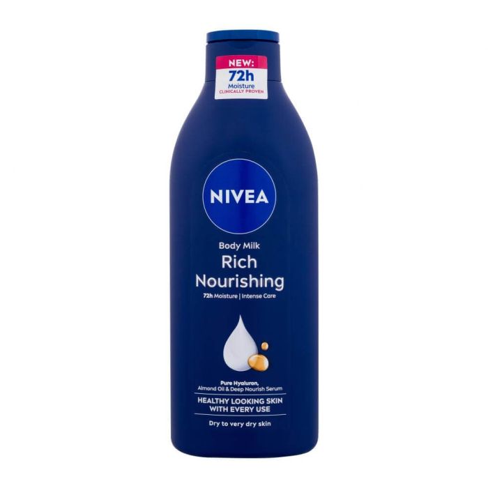 Nivea Rich Nourishing 48h+ Intensive Care Body Milk е подхранващо мляко за тяло, което омекотява кожата и я предпазва от напукване и изсушаване. Подходящо за суха и много суха кожа. Специалната формула съдържа уникална комбинация от активни съставки, които проникват в дълбочина и похранват и хидратират кожата. Нивеа Подхранващо мляко за тяло за суха и много суха кожа увеличава еластичността на кожата и стимулира регенеративните и защитните й функции. Деликатната текстура на млякото е лесна за нанасяне и приятна за употреба. След използване тялото е подхранено, освежено, с копринено гладка кожа и подобрен външен вид. Без парабени. Дерматологично тестван продукт.