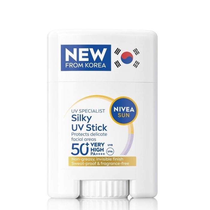 Nivea Sun Silky UV Stick SPF50+ е слънцезащитен стик за лице, който осигурява висока UV защита за лице отвъд стандартния SPF. Леката формула е ефективна срещу фотоостареенето, некомедогенна, позволява на кожата да „диша“. Полупрозрачната Silk Touch формула е невидима, водоустойчива, не лепне, не оставя следи, без аромат. Нивеа Сън Силки Сатенен стик за лице SPF50+ е дерматологично и офталмологично тестван, устойчив на изпотяване.