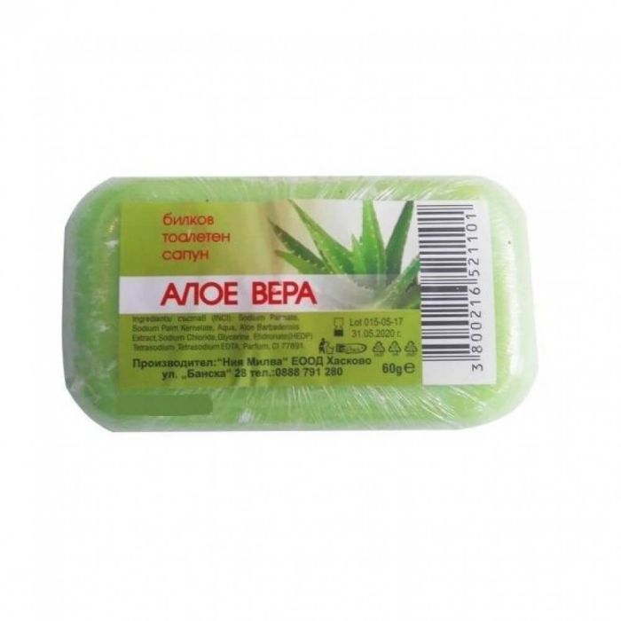 Nia Milva Тоалетен сапун с алое вера 60 гр е висококачествен сапун, обогатен с екстракт от алое вера. Ния Милва Тоалетен сапун с алое вера 60 гр ефективно почиства, успокоява, хидратира и тонизира кожата. Продуктът е подходящ за ежедневна употреба за цялото семейство. Сапунът оставя чудесно чувство на свежест след всяко измиване, като същевременно защитава кожата от изсушаване, подхранва я, прави я гладка и еластична благодарение на алое верата, богато на минерали, аминокиселини и витамини.