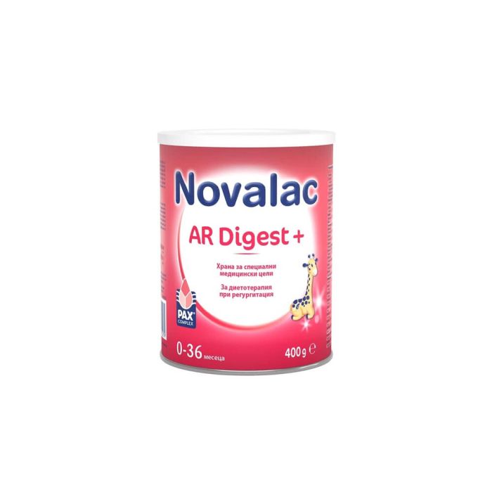 Novalak AR Digest + представлява адаптирано мляко, предназначено за кърмачета с регургитация (повишено повръщане и оригване), на възраст от 0 до 36 месеца, ако вече не са на майчина кърма. Продуктът отговаря на всички хранителни потребности на кърмене до 6-месечна възраст. След шестия месец и по лекарска препоръка, млякото става част от разнообразното хранене. Регургитацията е често срещан проблем на кърмачетата през първата година от живота им, който се проявява като неволно връщане на кърмата или храната от стомаха в хранопровода. Обикновено се проявява веднага или скоро след хранене (при оригване), по-рядко при сън. Новалак AR Дижест + Мляко за кърмачета при регургитация от 0 до 36 месеца е мляко, което съдържа царевично нишесте за оптимално сгъстяване на храната в стомаха, като по този начин намалява регургитацията при кърмачетата. Поради киселинното pH на стомаха, млякото се сгъстява само в стомаха, а не в шишето, което позволява течно хранене на кърмачето веднага след приготвяне на млякото. Употребата на млякото намалява честотата на регургитация. То задоволява всички хранителни нужди на кърмачето: обогатен е с желязо, съдържа оптималното количество мазнини и протеини и осигурява всички важни аминокиселини, минерали и витамини. Продуктът не съдържа генетично модифицирани организми (ГМО) и глутен. Предлага се в опаковка от 400 г.