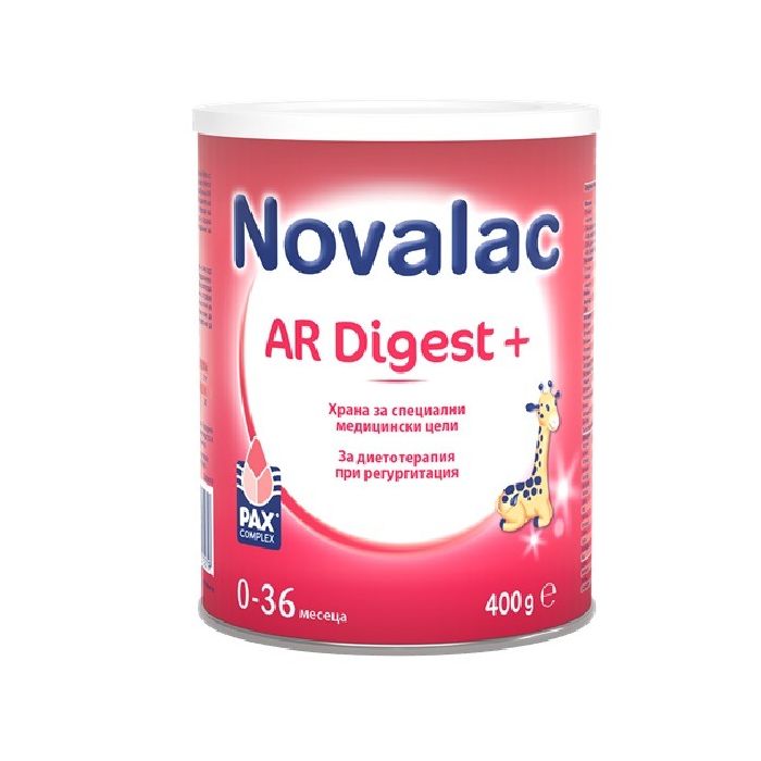 Novalak AR Digest + представлява адаптирано мляко, предназначено за кърмачета с регургитация (повишено повръщане и оригване), на възраст от 0 до 36 месеца, ако вече не са на майчина кърма. Продуктът отговаря на всички хранителни потребности на кърмене до 6-месечна възраст. След шестия месец и по лекарска препоръка, млякото става част от разнообразното хранене. Регургитацията е често срещан проблем на кърмачетата през първата година от живота им, който се проявява като неволно връщане на кърмата или храната от стомаха в хранопровода. Обикновено се проявява веднага или скоро след хранене (при оригване), по-рядко при сън. Новалак AR Дижест + Мляко за кърмачета при регургитация от 0 до 36 месеца е мляко, което съдържа царевично нишесте за оптимално сгъстяване на храната в стомаха, като по този начин намалява регургитацията при кърмачетата. Поради киселинното pH на стомаха, млякото се сгъстява само в стомаха, а не в шишето, което позволява течно хранене на кърмачето веднага след приготвяне на млякото. Употребата на млякото намалява честотата на регургитация. То задоволява всички хранителни нужди на кърмачето: обогатен е с желязо, съдържа оптималното количество мазнини и протеини и осигурява всички важни аминокиселини, минерали и витамини. Продуктът не съдържа генетично модифицирани организми (ГМО) и глутен. Предлага се в опаковка от 400 г.