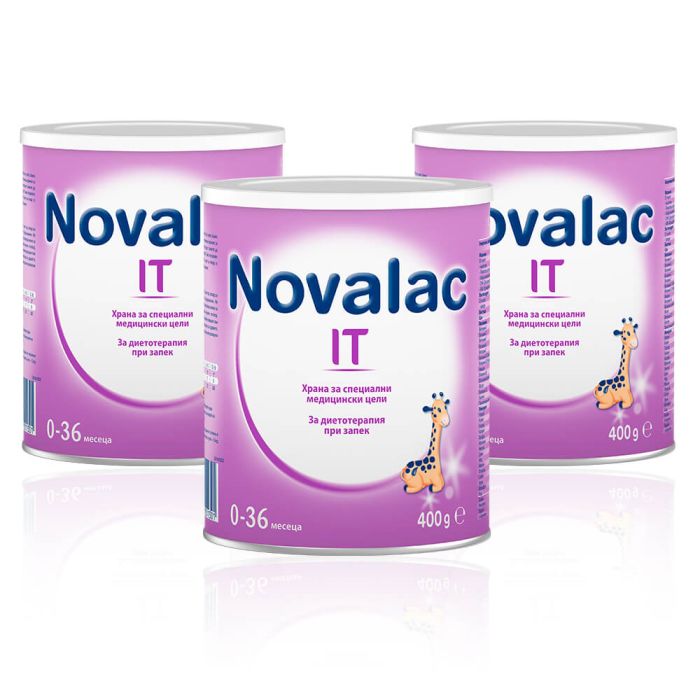 Novalac IT представлява адаптирано мляко, предназначено за кърмачета със запек на възраст от 0 до 36-месечна възраст, ако вече не са на майчина кърма. Мляко Novalac IT е предназначен за кърмачета от раждането до 36-месечна възраст, които имат по-твърди изпражнения или които се изхождат по-малко от 2 пъти седмично. За кърмачета, които имат проблеми с дефекацията (плачат и се напрягат силно при дефекация). Новалак IT Мляко за кърмачета при запек от 0 до 36 месеца е мляко с повишено количество лактоза и магнезий за облекчаване на дефекацията и предотвратяване на запек при кърмачета. В допълнение Novalac IT има повишено количество магнезий, който привлича вода и по този начин омекотява изпражненията, увеличава обема на изпражненията, влияе на движението на червата и по този начин позволява по-честа и по-лесна дефекацията. Увеличеното количество лактоза има двойно действие: тя привлича вода в дебелото черво и по този начин омекотява изпражненията и в същото време има пребиотичен ефект, тъй като е храна за полезните бактерии в червата ускорява тяхното размножаване и по този начин увеличава обема на изпражнения. Лактозата (млечна захар) в дебелото черво ферментира в млечна киселина, която увеличава движението на червата и по този начин облекчава дефекацията. Млякото Novalac IT отговаря на всички хранителни нужди на кърмачето, тъй като е обогатен с желязо, съдържа оптималното количество мазнини и протеини и осигурява всички важни аминокиселини, минерали и витамини. Продуктът не съдържа генетично модифицирани организми (ГМО) и глутен.