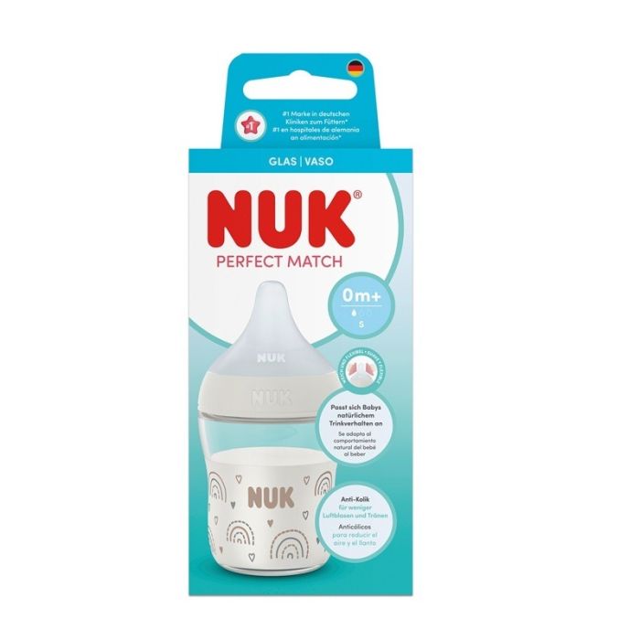 Nuk First Choise Temperature Control Шише стъкло биберон силикон S 0М+ Дъга е с нежен дизайн, леко и удобно. Разполага със силиконов биберон, размер S със слаб поток, подходящ за бебетата от деня на раждане. Биберонът е мек и еластичен и чудесно пасва на бебешката уста. С плавно стеснение, осигуряващо правилно захващане.