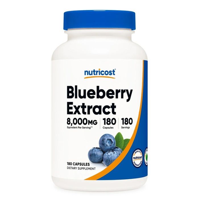Nutricost Blueberry Extract е хранителна добавка с висококонцентриран екстракт от Vaccinium corymbosum в съотношение 50:1, създадена за подпомагане на зрението, микроциркулацията и добрата форма на съединителната тъкан. Формулата е богата на антоцианини, полифеноли и витамин C, които осигуряват силна антиоксидантна защита. Синята боровинка подпомага нормалната функция на зрението, като допринася за по-добра адаптация на очите към светлина и тъмнина и подкрепя здравето на ретината. Същевременно активните ѝ съединения подпомагат микроциркулацията и правилното снабдяване на тъканите с кислород и хранителни вещества. Благодарение на изразеното си антиоксидантно действие, Нутрикост Синя боровинка помага за защита на клетките от оксидативен стрес и подкрепя здравето на съединителната тъкан, кожата, ставите и кръвоносните съдове.