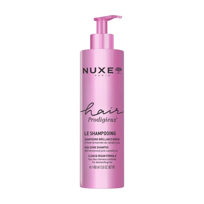 Създаден на базата на експертния опит на лаборатории Nuxe в грижата с растителни масла, Nuxe Hair Prodigieux High Shine Shampoo деликатно почиства косата и я обгръща с фин аромат. Формулата с ферментирало масло от розова камелия подхранва в дълбочина, без да утежнява косъма. Без сулфати и без силикони, тя запазва естествения баланс на косата, като ѝ придава чудесен блясък и копринена мекота още след първото измиване. Нежната текстура на Нюск Продижио Шампоан за интензивен блясък създава лека ароматна пяна, която превръща всяко измиване в момент на удоволствие. 94% съставки с натурален произход.