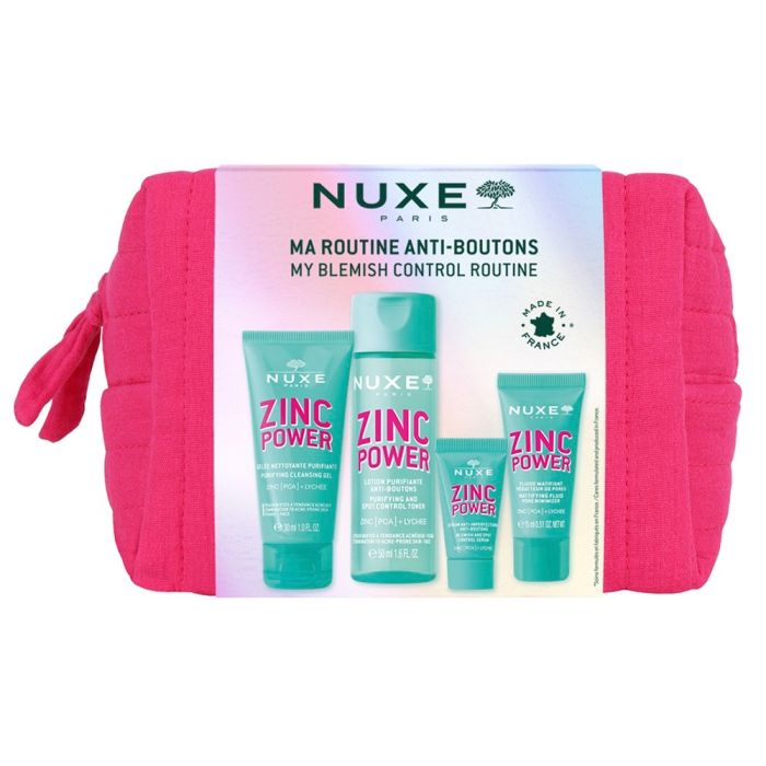 Комплектът съдържа: Nuxe Zinc Power Почистващ гел 30 мл. 1 бр. + Nuxe Zinc Power Почистващ тонер против несъвършенства 50 мл. 1 бр. + Nuxe Zinc Power Серум против несъвършенства 5 мл. 1 бр. + Nuxe Zinc Power Матиращ флуид против несъвършенства 15 мл. 1 бр. + Практичен несесер 1 бр.
