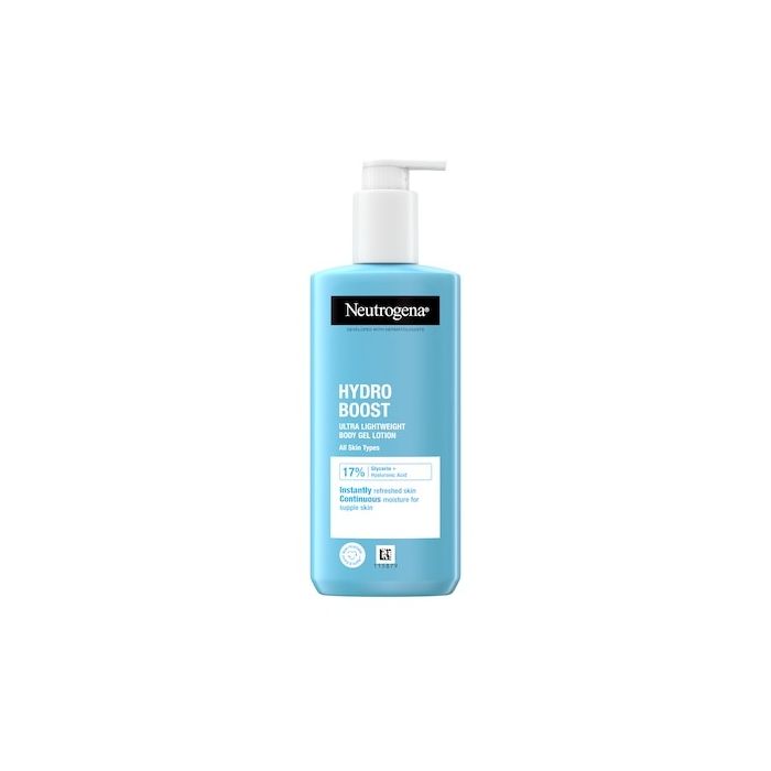 Neutrogena Hydro Boost Quenching body gel е хидратиращ ултра лек гел за тяло, който клинично доказано прави кожата еластична и сияйна. Леката му формула, със силата на хиалуроновата киселина дава на кожата допълнителна доза хидратация, като помага за за поддържане водния баланс на кожата, ревитализира и видимо подобрява състоянието на епидермиса. Нютроджина Хидро Бууст Хидратиращ ге-лосион за тяло действа в рамките на до 72 часа, попива бързо и не оставя мазни следи.Подходящ за чувствителна кожа. Тестван под дерматологичен контрол.