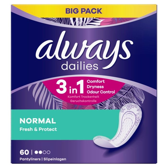 Always Dailies Fresh&Protect Normal Ежедневни дамски превръзки са с високо качество, с които ще бъдете свежи през целия ден. Олуейс Дейлис Фреш енд Протект са изключително тънки и с комфортен дизайн и предлагат страхотна комбинация от комфорт и защита. Можете да разчитате на тях всеки ден, без дори да ги усещате. Превръзките са леко ароматизирани и това допринася за усещане за свежест и сухота. Подходящи са за използване при вагинално течение или като допълнителна защита при нередовен цикъл. Дерматологично тествани. Предлагат се в опаковка от 60 броя.