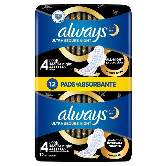 Always Ultra Secure Night Нощни превръзки ви предоставят висококачествена грижа и комфорт, докато спите. Превръзките имат специален дизайн с удължени крилца, които предпазват от разместване. Повърхността им е от деликатна, дишаща материя, която предотвратява изпотяване и не предизвиква раздразнение в интимната зона. Олуейс Ултра Секюър Найт Нощни превръзки имат силни абсорбиращи свойства, които гарантират, че спокоен сън без риск от протичане.