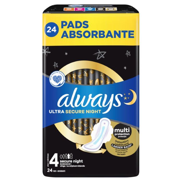 Always Ultra Secure Night Дамски нощни превръзки куатро х 24 бр са предназначени да осигурят защита, сигурност и комфорт по време на месечния цикъл на жената през нощта. Дамските превръзки Олуейс Ултра Секюр Найт са изработени от изключително деликатна памучна материя, която е нежна към кожата. Имат крилца, които са допълнително уплътнени и позволяват свободно движение без опастност от разместване или протичане.
