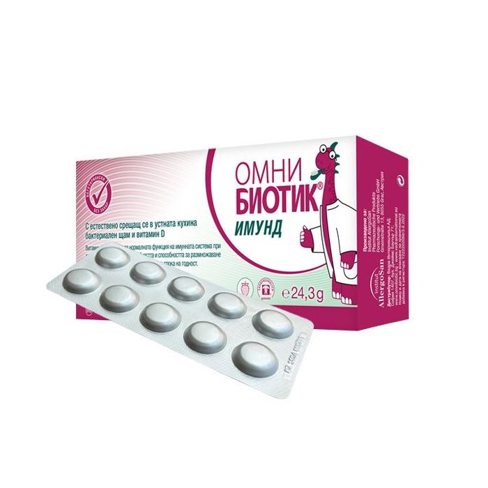 Omni Biotic ImunD е хранителна добавка с естествено срещащ се в устната кухина бактериален щам и витамин D. Разработката на всеки продукт от серията ОМНИ-БИОТИК® се основава на познанията и лабораторните тестове, които доказват действието на бактериите и способността им да се прикрепят към лигавиците като по този начин оказват благотворното си действие и дават оптимален принос за Вашето добро здраве. ОМНИ-БИОТИК ИмунД съдържа естествено срещащия се в оралния микробиом бактериален щам Streptococcussalivarius K12. Този щам е естествен за носната и устната кухина. Към ОМНИ-БИОТИК®ИмунД е добавен витамин D (холекалциферол), който допринася за нормалната функция на имунната система при деца и възрастни. С приятен вкус. Продукт, подходящ за вегетарианци. Не съдържа глутен, захар и лактоза. Предлага се в опаковка от 30 таблетки за смучене.