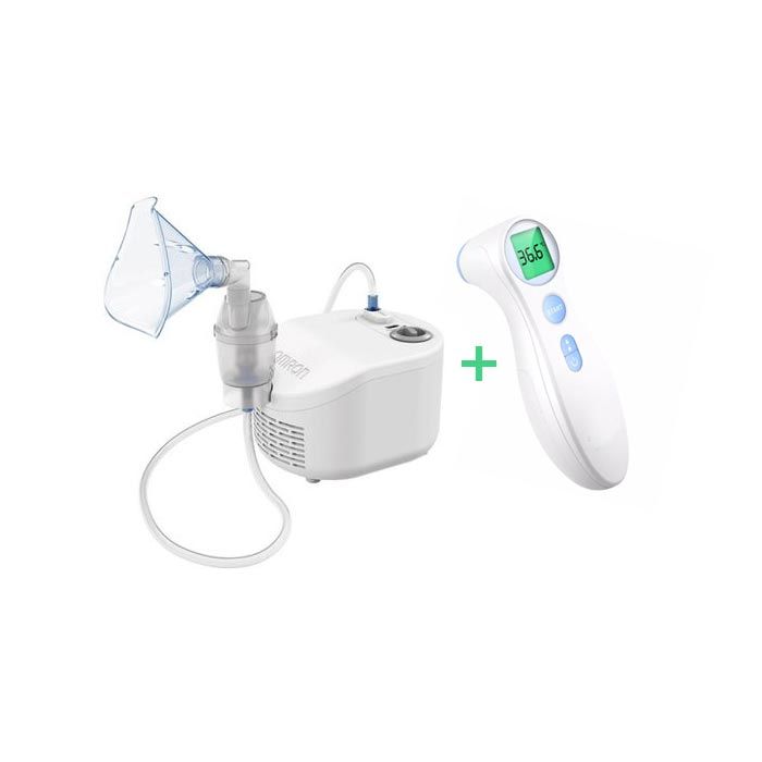 Комплектът съдържа: Компресорен инхалатор OMRON C101 Essential (NE-C101-E) 1 бр и Инфрачервен термометър за чело Termax DET-306-CD 1 бр