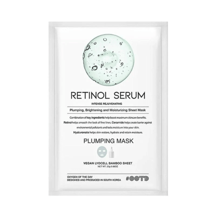 OOTD Retinol Serum Plumping Mask е интензивно подмладяваща регенерираща маска маска за лице. Подходяща за всеки тип кожа. OOTD Регенерираща лист маска за лице помага в борбата с бръчките. Видимо озарява, овлажнява и изглажда кожата. Съдържа ретинол, серамиди и хиалуронатен комплекс.