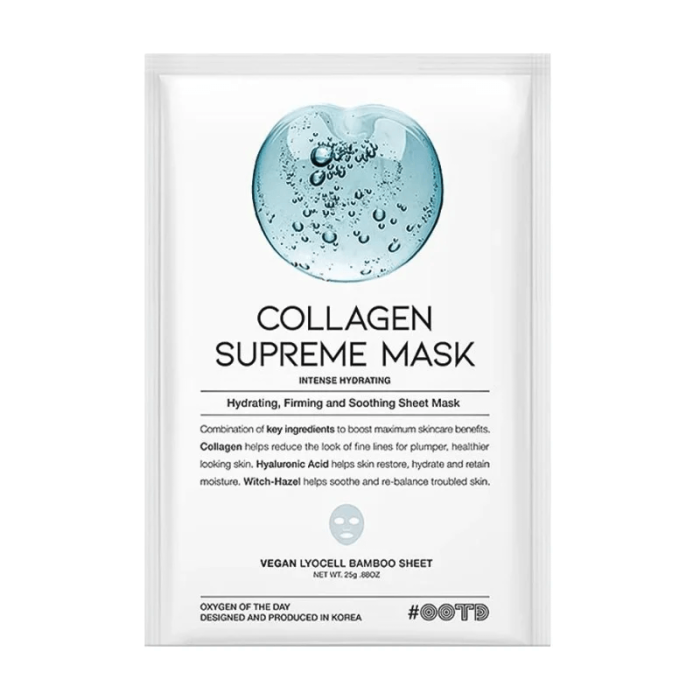 OOTD Collagen Supreme Mask е стягаща и хидратираща маска за лице с колаген, хиалуронова киселина и хамамелис. Подходяща за всеки тип кожа. OOTD Стягаща и хидратираща лист маска за лице осигурява интензивна хидратация и подхранване за по-младежки вид на кожата.